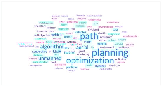 Table 3 illustrates the list of the final included studies, along with their proposed algorithms and types meta-heuristics. Furthermore, Figure 2 shows the word cloud of the included articles’ keywords, highlighting the most frequently used terms, such as “Path”, “Planning”, “Optimization”, “UAV”, and “Algorithm”.