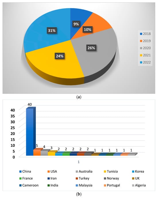 To specify the year and country with the highest number of contributions, we categorized the papers accordingly. As shown in Figure 3a,b, the year 2022 had the highest number of publications, and China had the highest number of articles.