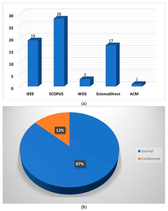 Figure 4 shows the distribution of the papers based on their database and publication venue. As is apparent, Scopus led with 28 papers, followed by IEEE with 19, ScienceDirect with 17, Web of Science with 3, and ACM with only 1. When it comes to publication venues, we found that the majority of the publications were journal articles (n = 59) and only 9 were conference publications.