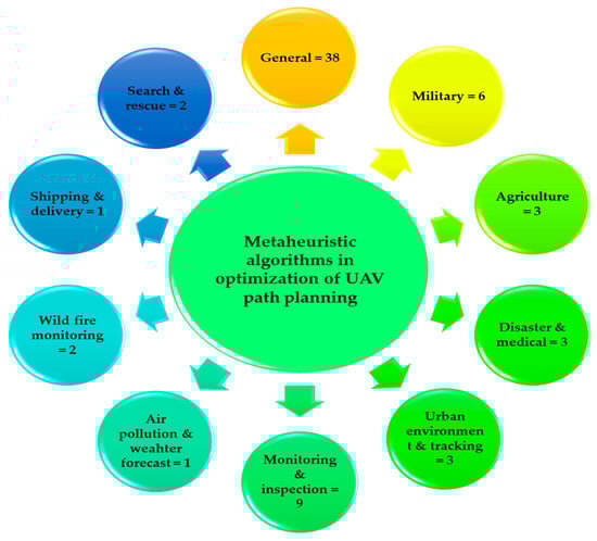 To highlight the applications of meta-heuristic algorithms in UAVs, we categorized them based on their application areas. As Figure 5 shows, 38 articles employed these techniques in general research in order to extend applications of UAVs with regard to different aspects. The other application areas include military, medicine, agriculture, etc.