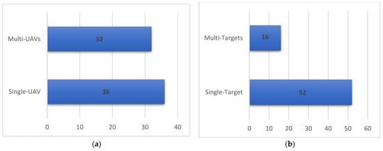 Comparison of UAV type(s) and UAV destination(s): (a) single-UAV vs multi-UAV uses; (b) single-target vs multi-target.