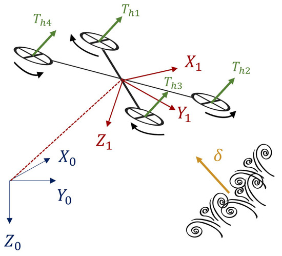 In this section, the mathematical expressions that describe both rotorcraft and external disturbances in the form of turbulent wind are introduced. The Newton–Euler dynamics of the quadrotor contemplate an inertial reference frame ( X 0 , Y 0 , Z 0 ) with origin at a point in the Earth and a body reference frame ( X 1 , Y 1 , Z 1 ) with origin in the center of mass of the UAV (see Figure 1). Moreover, the angular dynamics is considered to be the same in both frames since we assume small roll and pitch rotations [46]. Then, the equations of motion of the aerial vehicle are defined as