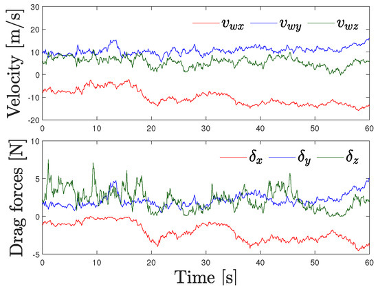 where m u is a nominal value of m such that m u m while s and c are the sine and cosine functions, respectively. External disturbance terms δ x , δ y , and δ z are analyzed as drag forces due to turbulent wind through the following equation [23]: