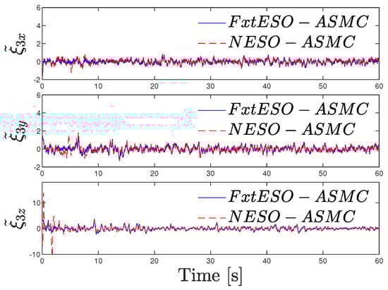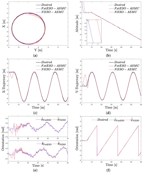The evolution of the disturbance estimation errors from both observer-based methods is displayed in Figure 7. Although their estimation performance under sensor noise conditions is accurate, we can notice that the NESO provided a larger peaking phenomenon than the fixed-time observer (see ξ ˜ 3 z ) due to the initial estimation error ξ ˜ z = 0.1 and the UAV mass uncertainty. As a consequence, Figure 8a shows that the FxtESO-based ASMC granted a more accurate trajectory tracking response with lower-amplitude oscillations at some points of the operation. Additionally, the trajectory execution in the z-axis from Figure 8b clearly portrays the effects of the peaking phenomenon on the NESO-based ASMC since the quadrotor was not able to take off as fast as the vehicle driven by the FxtESO-ASMC. Furthermore, the displayed trajectories along the x and y from Figure 8c,d demonstrate that the proposed method offered stronger robustness specifically during the hover flight stage of the trajectory where the NESO-ASMC presented deviations between 1 and 3 m. The effect of prior errors in the attitude subsystem is given in Figure 8e. We notice that, unlike in the proposed approach, the influence of the total disturbance in the system caused the quadrotor managed under the NESO-ASMC execute high-frequency rotations within the first 10 s of the simulation. On the other hand, Figure 8f illustrates that both observer-based controllers provided an effective tracking of the desired heading.