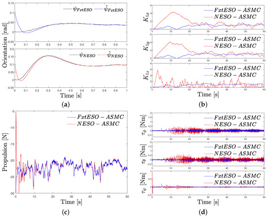 Figure 9. Quadrotor UAV trajectory. FxtESO and NESO–based adaptive controller comparison. (a) Yaw convergence, (b) Adaptive gains, (c) Required thrust, (d) Generated torques.