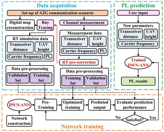 The overall PL prediction scheme is illustrated in Figure 1. In the first step, an A2G communication scenario is selected, and the measurement campaign is conducted in the chosen scenario to acquire measurement data, including the propagation distance, UAV height, carrier frequency, and the corresponding PL. Secondly, digital map reconstruction and RT simulation are carried out in the chosen scenario, and the RT pre-correction module is performed. Some of the measurement data are utilized to calibrate parameters such as the material conductivity for RT simulations. This calibration step aims to enhance the accuracy of the obtained RT simulation data significantly. Subsequently, the obtained dataset is split into the training and validation datasets, which are utilized for training the NN and assessing its performance, respectively. Finally, the DWN-ANN is constructed and the obtained RT simulation and measurement data are used for the pre-training and optimization training of the network, respectively. The trained DWN-ANN can accurately predict the PL by inputting a new propagation distance, UAV height, and carrier frequency.