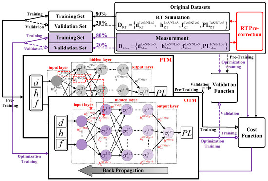 The proposed DWN-ANN consists primarily of a pre-training module (PTM) and an optimization training module (OTM), as illustrated in Figure 2. The PTM can utilize RT simulation data for preliminary training to learn the approximate relationship between the PL and other channel parameters. This enables the network to attain an initial stable state, reducing the required amount of measurement data and accelerating the network’s convergence rate. After pre-training, the network parameters of PTM are assigned to the OTM. The OTM can utilize a modest quantity of measurement data for fine-tuning, leading to the further optimization of the network parameters and enhancement of prediction accuracy.