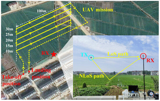 The channel measurement was conducted on a farmland at 3.6 GHz, and the ZC sequence is used in the channel sounder. The farmland area was approximately 150 m by 120 m, with sparse roads and low-rise buildings scattered around, resulting in an overall open environment. The RX was positioned at the edge of the farmland with the antenna at a height 2.5 m above the ground. The GPS coordinates for the fixed RX point were 118.57402 E 33.09518 N. Since the UAV normally flies at low altitudes for operations like yield estimation, precise irrigation, and crop monitoring in agricultural scenarios, we selected the UAV height range of 10 m to 30 m for the channel measurement campaigns. The UAV, equipped with the TX, took off from one side of the farmland and flew in a straight line with a 5 m height interval at different heights ranging from 10 m to 30 m and a flight distance of 100 m for each height, as shown in Figure 4. The GPS coordinates for the starting point of the horizontal movement of TX were 118.5736 E 33.09546 N. The receiver only started recording channel data when the UAV flew along the solid yellow line in the figure and stopped recording when it flew along the dashed yellow line. The PL data corresponding to different distances and UAV altitudes were obtained.