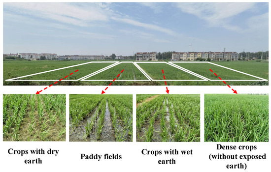 We further divided the measured farmland into four sub-scenarios: crops with dry earth, crops with wet earth, paddy fields, and dense crops (without exposed earth), as shown in Figure 5. After the channel measurement, we corrected the electromagnetic parameters of the ground materials for RT simulations based on some of the measurement data. The modified electromagnetic parameters of different materials are shown in Table 2.