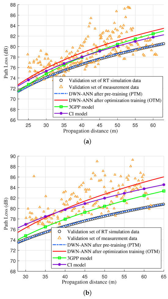 As shown in Figure 6, since the PL of the LoS path was not affected by the scatterer materials, the obtained RT simulation data relatively align with the measurement data. The measured PLs were slightly influenced by the elevation angles of the propagation paths because the actual antenna pattern was not perfectly isotropic. The predicted PL of DWN-ANN after pre-training and optimization training were, respectively, consistent with the RT validation dataset and measurement validation dataset, which demonstrates the accuracy of the proposed model. Moreover, the predicted values of our proposed model were consistent with the 3GPP model and closer to the measurement data than the CI model, which verifies that the proposed model conforms to the 3GPP standard and is superior to the traditional empirical model, allowing for the accurate prediction of the PL of the LoS path in the farmland scenario.