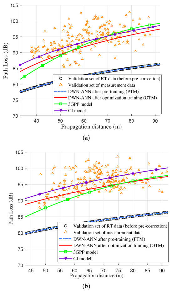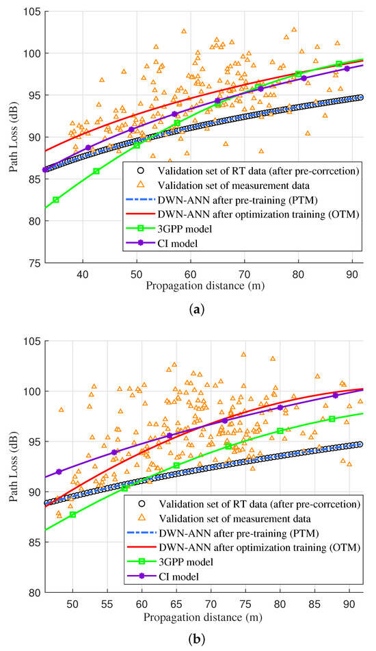 Due to the complexity of the ground materials and the significant influence of ground materials on the ground reflection path, without RT pre-correction, there was a relatively significant difference between the obtained RT simulation data and the measurement data. It was found that the prediction results of DWN-ANN after pre-training still matched the RT validation dataset, but the corresponding results after optimization training were slightly lower than the measurement data, which demonstrates a decreased prediction accuracy in comparison to the LoS case. However, the predicted PL was still close to the 3GPP and CI model, indicating the validity of the proposed model. Even when using default RT material parameters and with limited measurement data, the DWN-ANN can still improve prediction accuracy through joint training with RT and measurement data, achieving similar prediction results to traditional models.