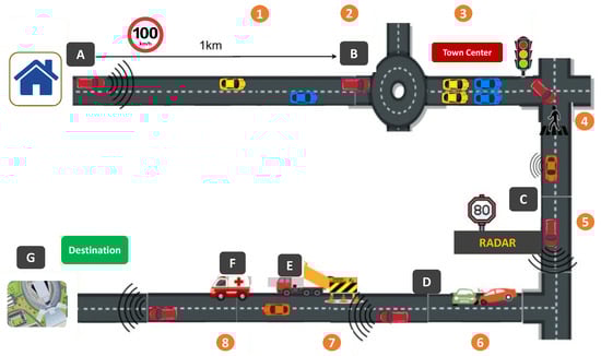 For an easy understanding of the complex urban environment and to highlight the challenges of specific urban environment settings, we decompose the environment into various scenes as shown in Figure 1. These scenes include: (i) Scene 1 with Lesser Dynamics—as it can be seen, that scene 1 between focuses on the road segment that presents straightforward dynamics, e.g., clearly marked roads, smooth traffic, etc. Such dynamics ask for simplistic environmental understanding and consequently a limited set of critical maneuvers. Furthermore, in this scene, the local perception of the environment is good enough for AV to make decisions. (ii) Scene 2 with Roundabout Challenge—in this scene, the autonomous vehicle is faced with going through a roundabout, which is a challenging scenario that requires consistent interaction with other vehicles. In this scene, it is not possible for an AV to cross the roundabout and interact with the neighboring vehicles solely relying on its onboard sensors. Therefore, it is indispensable for the AV to have an extended perception of the environment by collaborating with the neighboring vehicles leveraging vehicle-to-vehicle (V2V) communication, and creating short-term platoons. The collaboration would result in increased safety and traffic flow at the roundabout. (iii) Scene 3 with Congestion Settings—the road segments that are usually in the city centers with a lot of traffic and reduced speed. In this scenario, the local perception of the environment is not enough for the AV to navigate safely and timely in these congested settings. Therefore, realizing the solution of autonomous driving for such settings requires enhanced vehicular collaboration and platooning format for very short time quanta. (iv) Scene 4 with Sharp Turn and Vulnerable Road Users—the challenge is obvious for vehicles that solely rely on onboard sensors. These classical vehicles would not be able to detect pedestrians due to manifold reasons: (1) due to the limited local perception of the vehicle; (2) occlusion and deformation; (3) due to weather conditions. It is claimed that the realization of the collaboration using V2V and vehicle-to-infrastructure (V2I) communication would provide AVs with an extended perception of the environment as a result, accurately predicting the pedestrians and vulnerable road users. (v) Scene 5 with Sudden Speed Change Zones—the road segments with a sudden change in the speed zones force the vehicles to react unprecedentedly. The AV equipped with heterogeneous sensors (camera, LiDAR, Radar, etc.) is capable of detecting road signs, however, the conventional decision making with a narrow environmental understanding and short lifespan of decisions in terms of time and distance would compel the AVs to make myopic decisions, resulting in erroneous decisions, injuries, fatalities, etc. Hence, having such information known in advance leveraging collaboration with far-ahead vehicles would allow the vehicles to react proactively in a timely and safe manner. (vi) Scenes 6 and 7 with meeting road blockage due to accident—such situations are unprecedented and hamper the usual traffic flow. In these scenarios, relying solely on the local perception of the environment would not allow the AV to know about the accident in advance, resultantly omitting the vehicle to take decisions in advance. Therefore, it asks for dynamic adaptation of the collaboration with other road users including other vehicles. Furthermore, the need for extended collaboration may prove to be instrumental (i.e., by implementing the collaboration with farther vehicles/groups of vehicles, etc.) Collaboration with farther vehicles would allow the AV to have a wider perception of the environment in advance and take optimal decisions proactively. (vii) Scene 8 with an emergency vehicle on the road—in situations, where emergency vehicles appear on the road, the norm of usual traffic is to be avoided. Such situations could also be handled by efficient collaboration among the vehicles. Collaboration would enable the AVs to communicate directly with each other or through the smart tower deployed on the road and make way for the emergency vehicle.