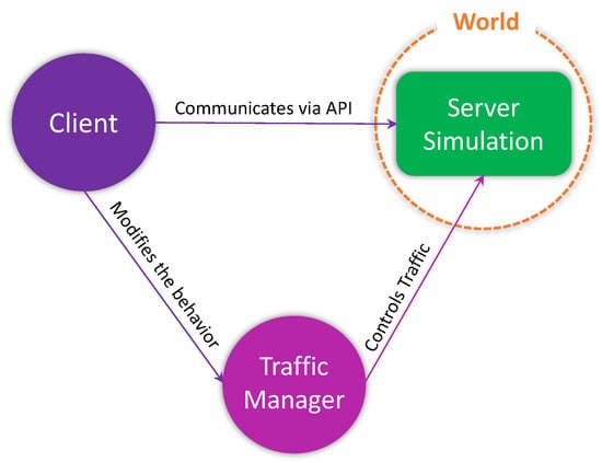 CARLA utilizes the client-server model for its operation where the server runs the actual simulation and the client is responsible to communicate and controlling that simulation. The CARLA client communicates with the CARLA server using the provided API. Therefore, to use the CARLA client, we first establish a connection with the CARLA server running on a specific IP and port. Multiple clients can also be used to communicate simultaneously with a server. The main functionality of the client is to ask for information from the server, load different maps, record simulations, and initialize the traffic manager. The classical architecture of CARLA is presented in Figure 2.