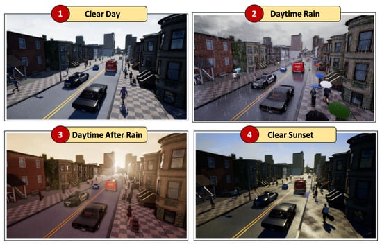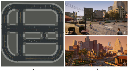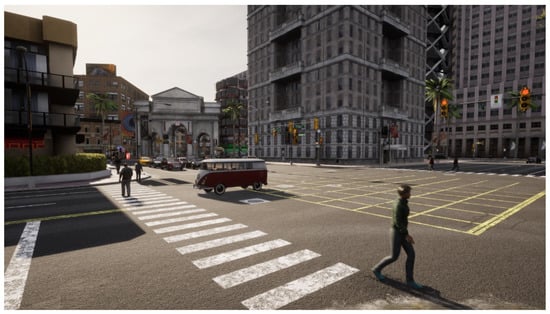 Vukic et al. [15] developed an urban-like neighborhood simulation environment based on Unity to test sensors and algorithms for autonomous vehicles and to show the deviations from reference data. The proposed simulation model comprised city objects and participants such as roads, sidewalks, buildings, pedestrians, traffic signs, and vehicles. They simulated the motion and sensors from a single vehicle equipped with a stereo camera setup. Unity was used to design the simulation; however, the behavioral scripts were executed using the C# programming language. The OpenCV class for computing stereo correspondence employing the semi-global block matching algorithm was applied to simulate stereo images to demonstrate the testing of relevant algorithms.