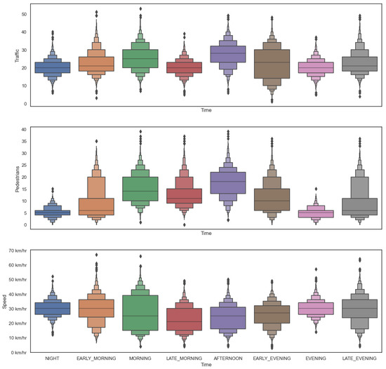 Distributions of Speed, Traffic, and Pedestrian counts with respect to time.