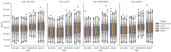 Distributions of Vehicle speed with respect to Rain, Clouds, and Fog.