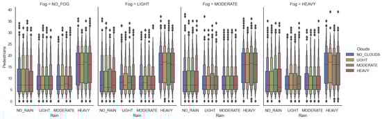 Distributions of Pedestrian count with respect to Rain, Clouds, and Fog.