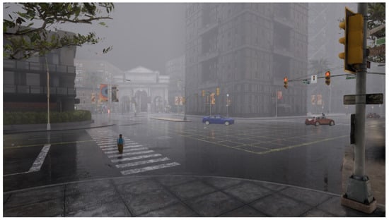A view of simulation environment showing heavy rainy day with a small number of traffic and pedestrians.