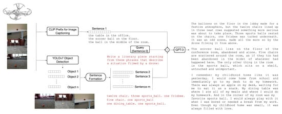 We propose a general pipeline for UAV real-time literary storytelling (see Figure 2) that is based on the previously described captioning technique that utilizes CLIP prefix captioning [4,5,28] and that combines the obtained sentence trained with Conceptual Captions [29] with detections given by YOLOv7 [6]. The output of the object detector is processed by a module of sentence formation such that it can be fed into a GPT-3 module, which provides an enhanced literary description. A query formulating the task to be determined by GPT-3 is needed. The system can work in real time on the streaming frames of the vehicle or as a post-processing module once the UAV has landed.