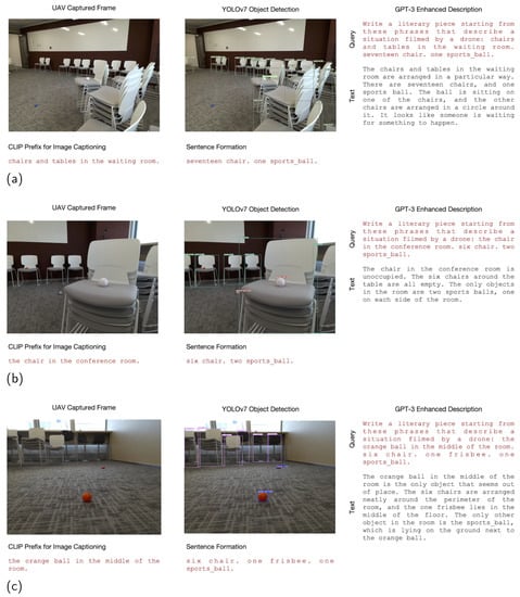 Experiments were conducted on a well-controlled challenging environment with the use of RYZE Tello, streaming the data in real time to a ground computer that processes the frames one by one. Figure 3, Figure 4, Figure 5 and Figure 6 illustrate all of the stages of the used methodology for a number of UAV captured stream frames, with contrasting levels of descriptive goodness. The drone captures a particular visual scene that is consequently sent to the ground computer, where a first caption is generated using CLIP Prefix for Image Captioning with beam search. The caption is improved by the output of a YOLOv7 object detector after sentence formation. Finally, a query is formulated together with the resultant caption to generate an enhanced text description by the GPT-3 module. The results are consistent and robust and exhibit original and genuine descriptions of the imagery, and the modules of captioning and object detection are effective and efficient.