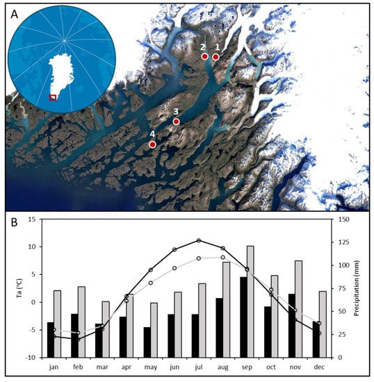 (A) The study region and the location of Narsarsuaq (1), Qassiarsuk (2), Qaqortukulooq (3), and Qaqortoq (4). Landsat image courtesy of the U.S. Geological Survey. (B) Average monthly values of air temperatures (points) and precipitation (bars) for the period 1990-2020 at two official meteorological stations located in Qaqortoq (grey) and Narsarsuaq (black) [29].
