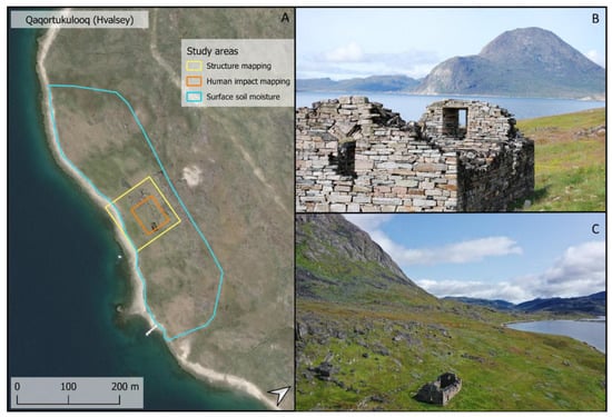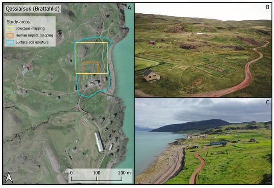 The archaeological ruins at Qassiarsuk, also known as Eric the Red’s Farm, lies on the coast of the Tunulliarfik Fjord, approximately 20 km from the Greenland Ice Sheet. Narsarsuaq, the region’s only international airport, lies across the fjord to the east. Because of its high-profile status, Qassiarsuk has been one of the most intensively investigated and documented archaeological sites in Norse Greenland. Our study focused on a small part of Erik’s farm, covering the church and some other relevant ruins (Figure 2). The most recently documented excavation at the site was conducted between 2005 and 2006 [30].