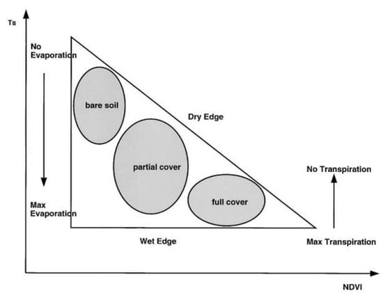 The TVDI is a semi-empirical method that delimitates the triangle formed when plotting surface temperature (ẟTS) versus NVDI [37,39,40,41] (Figure 4). The upper boundary is called “dry-edge” and represents dry soils and stressed vegetation with the surface temperature at its maximum. The lower boundary is called “wet-edge” and represents conditions with minimum surface temperatures and where the evapotranspiration is close to the potential rate. TVDI is calculated from Formula (3):