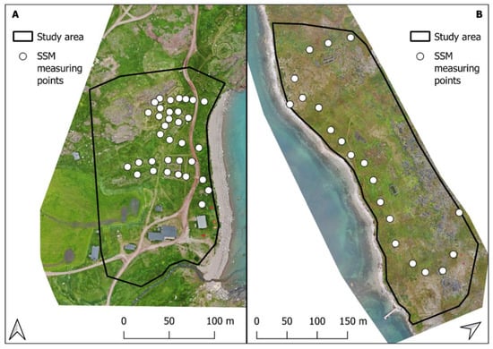 Soil moisture content was measured in 0–5 cm depth at Qassiarsuk (A) and Qaqortukulooq in 2021 (B). Measuring points (white dots) were selected and distributed in the field according to site area size and topography and to cover variation in vegetation cover and plant species’ distribution.