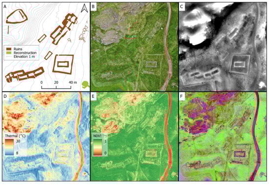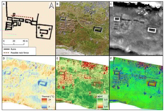 Qassiarsuk. Comparison of mapping potentials of different maps. (A) Map of structures from the 2005–2006 investigations [30], (B) RGB map 2021, (C) DSM MSRM map 2021, (D) thermal (°C) map 2021, (E) NDVI map 2021, (F) PCA map 2021.