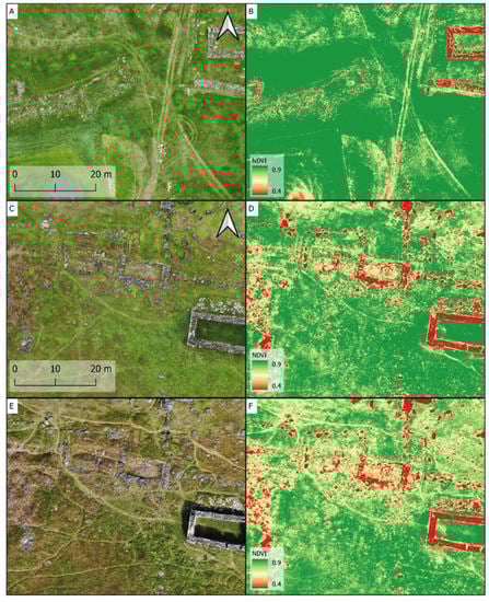 Accessibility to the Arctic has improved as a direct consequence of increasing seasonal sea ice melt and is expected to drive the development of coastal infrastructure and cruise tourism in many parts of the Circumpolar North in the next decades [43]. In areas that are already accessible by expedition cruise ships such as in south Greenland, tourist visits are anticipated to increase markedly in the coming decades, especially at high-profile sites such as Qassiarsuk and Qaqortukulooq. Tourism is known to be a contributing factor to processes of transformation and decay in cultural heritage [44]. Visitor impacts can be linked to people walking through the archaeological sites, physically disturbing structures and manipulating or removing loose objects lying on the surface. Over time, such activities can irreparably damage or destroy the integrity of cultural heritage features. Therefore, it is important to find a balance among site access, use, and preservation. It has previously been shown that drones equipped with an RGB camera can be used to monitor the wear of vegetation and trail conditions [45].