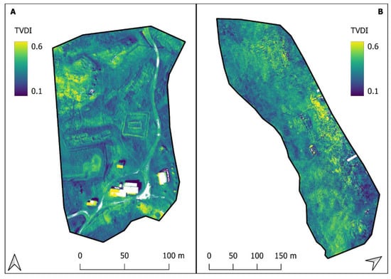 Temperature Vegetation Dryness Index (TVDI) maps of Qassiarsuk 2021 (A) and Qaqortukulooq 2021 (B). Theoretically, values closer to 1 indicate dry areas and values closer to 0 indicate wet areas.