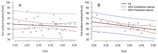 Regression analysis between TVDI and on-site SSM measurements (circles) at Qassiarsuk (A) and Qaqortukulooq (B).