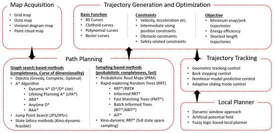 A generic motion planning framework for mobile robots can be divided into map acquisition, path planning, trajectory generation, trajectory optimization, and trajectory tracking. Map acquisition is the process of acquiring and representing the spacial environment (workspace) of robots in a structured way. Commonly used structured maps include occupancy grid maps [1], octomaps [2], point cloud maps [3], Voronoi diagram maps [4], Euclidian signed distance fields [5,6], etc. The quality and accuracy of these maps directly influence the path planning performance. The goal of path planning is to find piecewise linear segments from a current point to a target point in a robot’s configuration space (C-Space) while avoiding obstacles. This path can be represented by a set of points (called waypoints or knot-points) joining those linear segments. We may broadly classify path planning algorithms into Graph-Search-Based Algorithms (GSBAs) and Sampling-Based Algorithms (SBAs) [7]. Commonly used algorithms for both graph-search-based algorithms, as well as sampling-based algorithms, are shown in Figure 1. Path planning algorithms usually consider the geometric constraints of the robot’s workspace but ignore the dynamical limitations of the robots. Therefore, the final segmented paths suggested by the path planner might not be executable by the actual robot. The trajectory generation and optimization process considers the dynamics of the mobile robot along with other constraints (e.g., safety constraints, kino-dynamic constraints, etc.) and incorporates the time-allocation mechanism to empower the motion planner with a better executable and optimal trajectory. Therefore, by cascading path planning with trajectory generation and optimization, a motion planner can finally generate kino-dynamic-feasible, collision-free, executable, and trackable trajectories that satisfy several optimization constraints and objectives.
