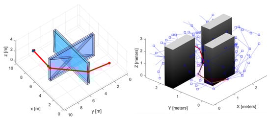 Robotic path planning with the GBSA (JPS-3D) algorithm on the left and the SBS (RRT*) algorithm on right. The planned path through the environment is comprised of piece-wise line segments shown in red. Note the considerably small length of one segment in the path planned with the JPS-3D algorithm in close proximity to the thin wall.