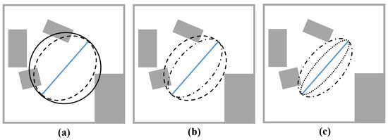 Ellipsoid shrinking process shown in 2D, where grey area represents obstacle space of environment map. The blue solid line segment represents a single segment of the planned path. Left (a): We start with a black solid-line ellipsoid shown in (a). We find a point in the obstacle space that is closest to the center of the blue path segment to generate the black dashed-line ellipsoid. This completes the first iteration of ellipsoidal shrinking. Center (b): Now, we take the black dashed-line ellipsoid generated in (a) as a reference and repeat another iteration of the shrinking process to generate a black dashed-dotted-line ellipsoid. Right (c): Again, we take the black dashed-dotted-line ellipsoid generated in (b) as a reference and repeat another iteration of the ellipsoid shrinking process to generate the black dotted-line ellipsoid shown in (c). After this iteration, we may define -plane of ellipsoid.