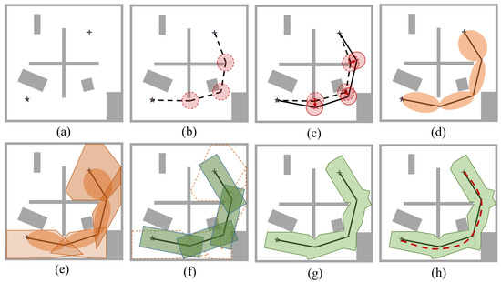 Robotic motion planning process in sequence in 2D. (a) Map of the environment representing obstacles (grey areas), starting location (four-point star), and goal location (five-point star). (b) Initial path planned with planning algorithm (dotted line segments). Margin spheres are represented in red at waypoints. (c) The modified path after the application of the path relocation procedure (solid line segments). (d) Path segments with obstacle-free ellipsoids superimposed on corresponding segments. (e) Representation of polyhedra encapsulating corresponding ellipsoids (in orange color) on every path segment. (f) Cuboidal bonding of polyhedra (in green) to find tunnel-like pathway. (g) Intersection of polyhedra and cuboids to find obstacle-free corridor (OFC) represented in green. (h) Obstacle-free corridor along with optimized trajectory represented in red with dashed lines.