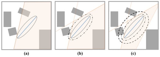 Ellipsoidal dilation and polyhedron finding process. Orange-colored solid-lines represent the hyperplanes that we find in each iteration of the ellipsoidal dilation process. Light-shaded orange areas represent the halfspaces defined by these hyperplanes. Left (a): We start the ellipsoidal dilation process with the ellipsoid represented with dotted-line and find the first hyperplane as shown in (a). Center (b): We dilate further to find the second hyperplane, which is tangent to the ellipsoid represented with dashed-dotted-line and shown in (b). Right (c): Again, we dilate once last time to find the third hyperplane, which is tangent to the third ellipsoid (represented with dashed-line) and shown in (c). By finding the intersection of these halfspaces (defined by corresponding hyperplanes), we may form a polyhedron for the corresponding segment.