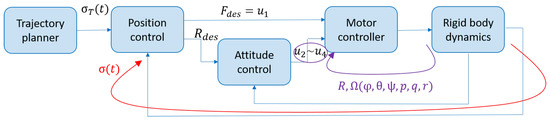 where and are diagonal gain matrices. This allows unique gains to be used for roll, pitch, and yaw angle tracking. Finally, we compute the desired rotor speeds to achieve the desired control vector by using Equation (4). When controlling position and attitude together, we use a cascade control loop where attitude is controlled in the inner loop while the position is controlled in the outer loop as shown in Figure 11.