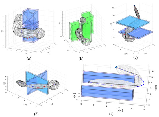 Trajectories simulated with different scenarios. Optimized reference trajectories are presented in blue while trajectories tracked with a controller are presented in red. We used five different scenarios for the simulation of our navigation algorithm. Each scenario represents ellipsoids generated for Obstacle-Free Corridor (OFC) construction for corresponding path segments. Scenarios are named (a) Vertical boxes, (b) Vertical columns, (c) Multiple floors, (d) Multiple rooms, and (e) Long Corridor.