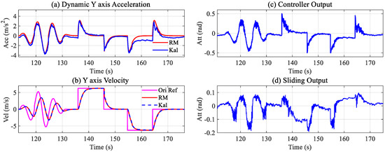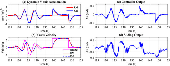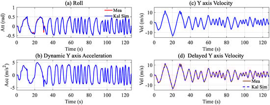 Figure 5 shows the estimated results, where Figure 5b,c show the dynamic acceleration and velocity changing under the input. The red lines in Figure 5a,d represent the measured roll and velocity, respectively, and the estimated results coincide exactly with the measured data. Therefore, the estimated dynamic acceleration and the real-time velocity are completely trustworthy.
