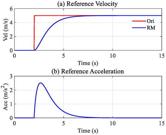 The red line in Figure 6a is the original target velocity and the blue curve is the processed reference velocity; the acceleration reference shown in Figure 6b is also planned simultaneously. The transition process can be completed within 6 s. The specific tracking time can be adjusted by changing the parameters in .
