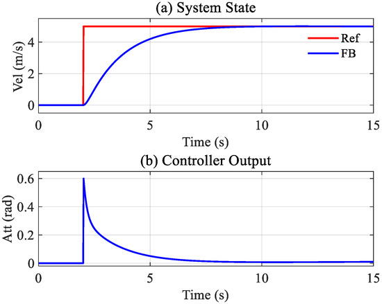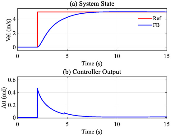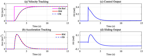 From Figure 7a,b, the velocity and acceleration can adequately track the relevant target, and the tracking process is completed within 6 s, which is consistent with the reference model simulation results. From Figure 7c, it can be seen that the maximum controller output is 0.4 rad, which is within the assumed safe range. In addition, there is no chattering in the process.