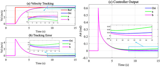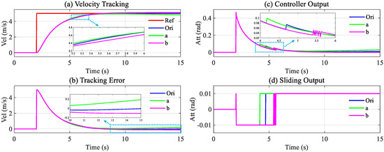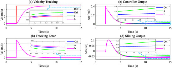 The velocity tracking error of the three methods in all three cases are summarized in Table 3. It should be noted that the three schemes are mainly used to verify the robustness of unknown parameters, and indicators such as the rise time are not considered. Therefore, comparing the three algorithms with their respective initial situations is valuable. Hence, in the columns for cases ‘a’ and ‘b’, the statistical data represent the changes compared to the original case.