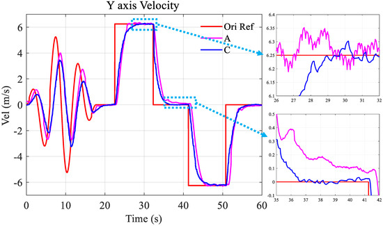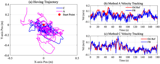 Figure 17a records the dynamic trajectories of the two methods during the hovering. In contrast, the blue curve shows more compactness. Figure 17b,c show the two methods’ velocity reference and feedback. In Figure 17b, it can be seen that there are several situations where the velocity target could not be tracked well, such as 40–50 s, 60–70 s, and 80–90 s. In contrast, this phenomenon was not found in Figure 17c.
