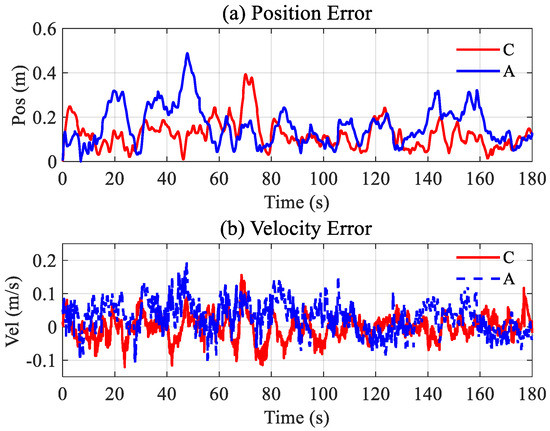 The tracking errors of the position and velocity during the hovering are shown in Figure 18a,b, respectively. It can be seen that the position error of Method A is more noticeable compared to Method C, with an average of approximately 0.2 m; further, the velocity tracking error has a more evident amplitude fluctuation over 100–180 s.