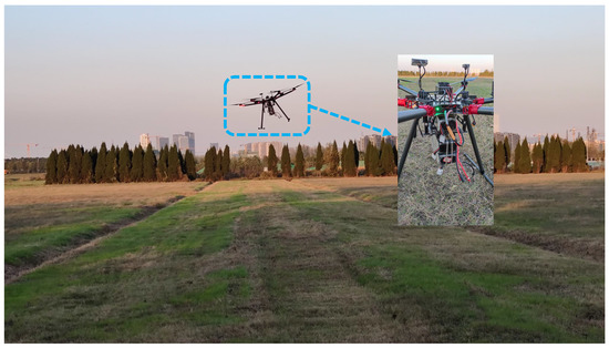 The proposed scheme was established in a six-rotor UAV with a wheelbase of 960 mm for verification, as shown in Figure 3.