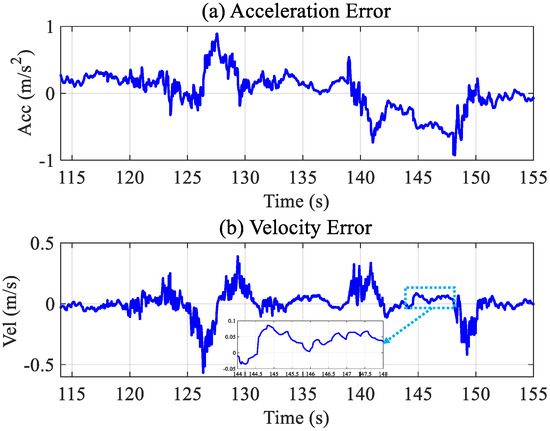 Figure 22 shows the tracking error between the acceleration and velocity. When the velocity catches up with the target, it can be kept within ±0.1 m/s of it, as shown by 144–148 s in Figure 22b. Relative to the target velocity of 6.25 m/s, the steady-state error can be negligible.