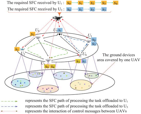 A heterogeneous Multi-UAV edge computing scenario. Each UAV deploys several SFs and can receive the SFC required from the devices on the ground. The master UAV controls the resources of the edge computing network, which can instantiate the required SFCs.