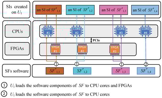 The creation process of SIs on . The SI of FPGA-dependent SF (i.e., , , and ) occupies a CPU core and an FPGA. Moreover, the SI of FPGA-independent SF (i.e., ) only occupies a CPU core.