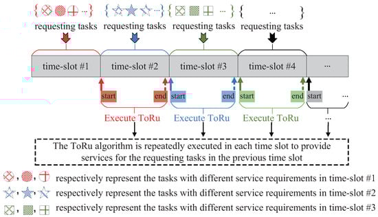 The proposed ToRu is deployed on the master UAV. In order to providing a long-term service for unknown tasks in an online manner, a time-slot partition protocol is designed, as shown in Figure 3. The mission period is divided into time-slots with equal length. One time-slot is the basic unit for SFC scheduling. At the beginning of each time-slot, the master UAV starts ToRu with the requesting tasks arriving in the previous time-slot and the current idle resources on the UAV network as input parameters. ToRu completes SFC scheduling before the end of a time-slot and exits. According to the above process, ToRu is executed repeatedly in each time-slot, thus enabling the UAV network to provide the long-term service. Note that ToRu must complete SFC scheduling before the end of a time-slot, otherwise the time-slot length needs to be increased, which indicates that the number of task requesting service is too large. If ToRu completes SFC scheduling very early before the end of the time-slot, it means that the number of tasks requesting service is small and the time-slot length should be shortened, thus reducing the service waiting time of tasks. Therefore, the time-slot partition protocol proposed in this paper has good dynamic scalability.